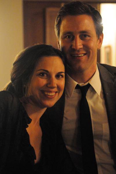 This picture of a couple shows a man and woman smiling; he faces straight into the camera while she leans in to get in the picture. |