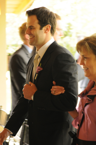 The mother of the groom is escorting her son. |