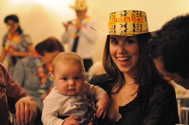 A woman at a party holding a baby wearing a yellow, red and black hat. |