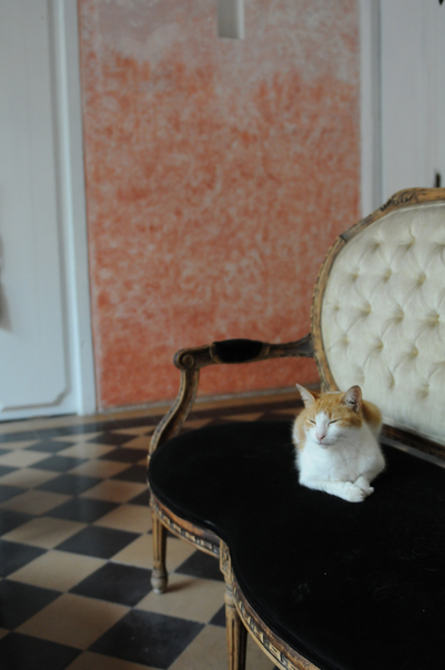 The black and white chair has a brown and white cat sitting on it. |