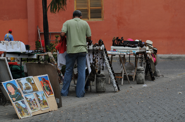 This photo shows vendors stands at a flea market; the first display pictures, the second decorative chains which a man is examining, and at the last is a collection of hats while in the background a workman paints a rust red wall.