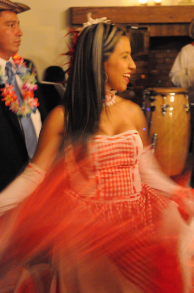 A woman wearing a traditional red and white dress dances around the room as others watch her. |