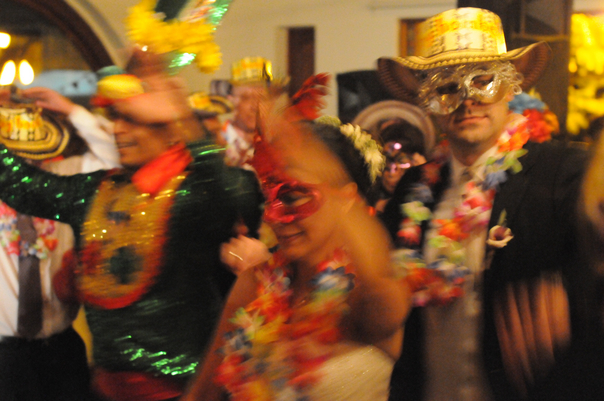 Colorful and glittery-clad revelers at Mardi Gras happily parade down iconic Bourbon Street. |