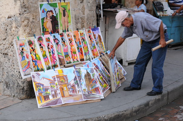There is an older man looking at some colorful art that is set up on the sidewalk on a street corner. |