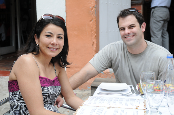 A young couple enjoying a quiet outdoor late lunch are asked to pose for a picture taken by a tourist. |