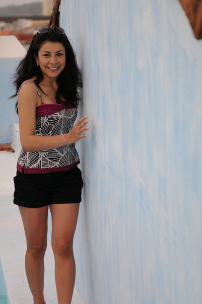 A girl wearing a zebra-pattern t-shirt and black shorts is touching a light blue-colored wall. |