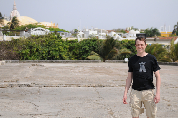 This is a man wearing a black shirt and khaki shorts standing on concrete. |