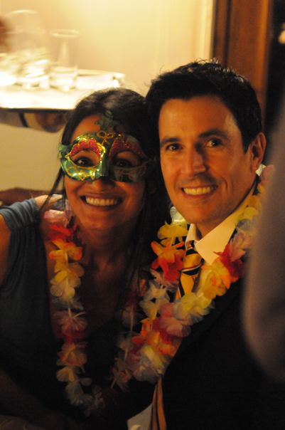 Two people pose for a picture together while sporting smiles during a celebration. |