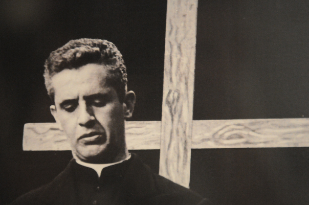 A cross is there behind a man who is looking down |
