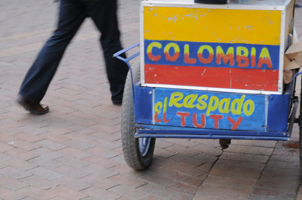 A colorful vendor cart in the street as a man in long black pants walks by. |