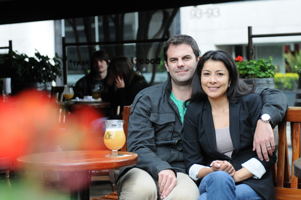 A happy couple sits and poses for the camera out on the patio. |
