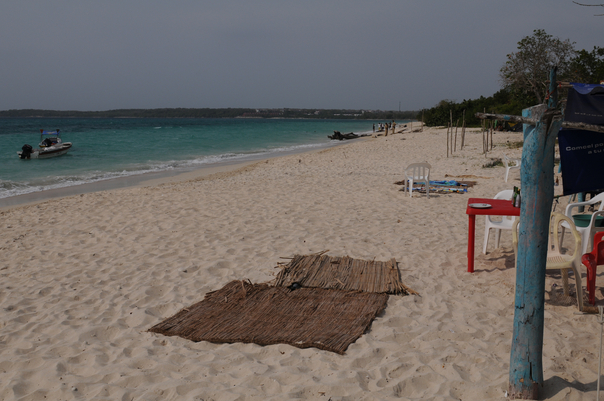 This photo shows two rustic woven brown mats on a beach with modern plastic outdoor furniture scattered about and a weathered green pole. |