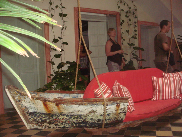 The porch swing was fashioned out of a large bench and covered with a soft, red cushion. |