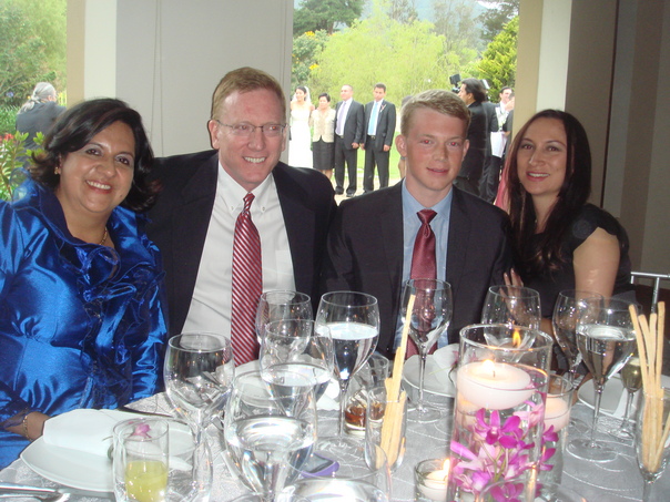 A middle-aged and a young couple seated at a table pose for a photo. |