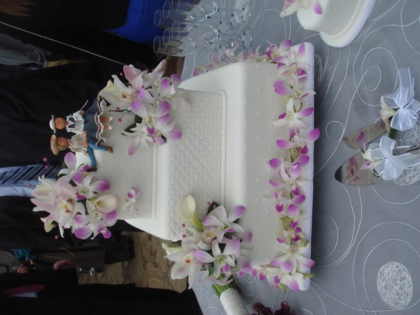 This is a three layer wedding cake with two people sitting on top