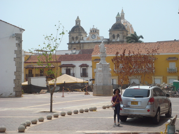 There is a petite woman walking down a brick paved location near a construction zone in front of some beautiful ornate buildings. |