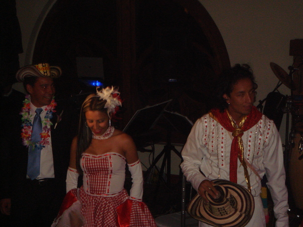 A man wearing a hat and a lei, a woman in a red dress, and another man in native garb walk into a room. |