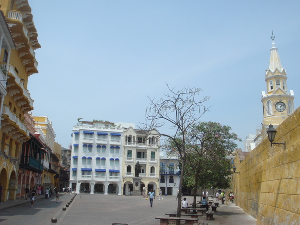 People are walking around a paved plaza between buildings with arched doorways at the street level. |