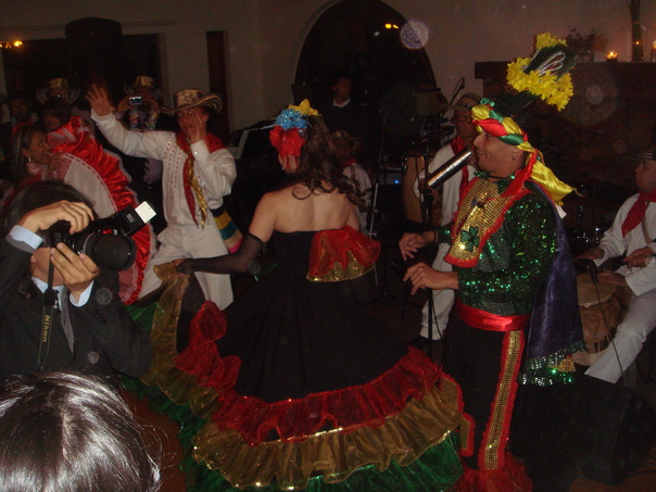 Several men and women dressed in colorful costumes are dancing while a man photographs the scene. |