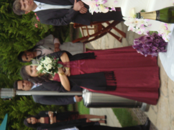 A bridesmaid holds a bouquet of flowers during this outdoor wedding.