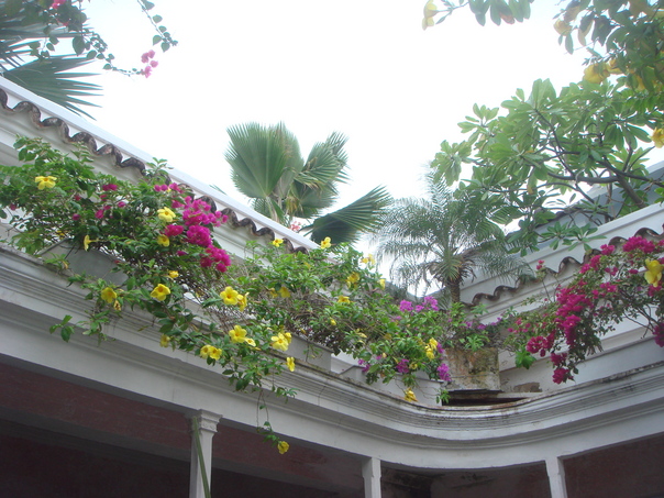 There is an outside setting with palm trees and various colorful flowers growing. |