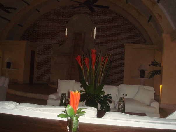 This is a very open arched room with clean furniture, colorful plants and an oasis like atmosphere. |