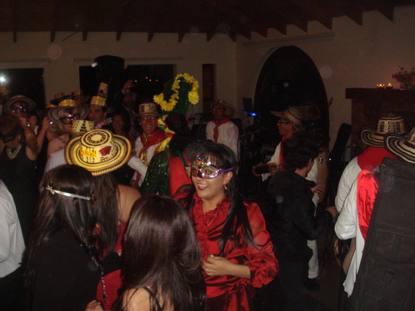 People are at a party in red, white, and black costumes and masquerade masks. |
