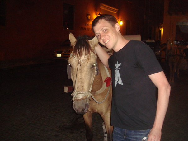 The boy is wearing a black t-shirt and is posing with a horse that is brown in color. |