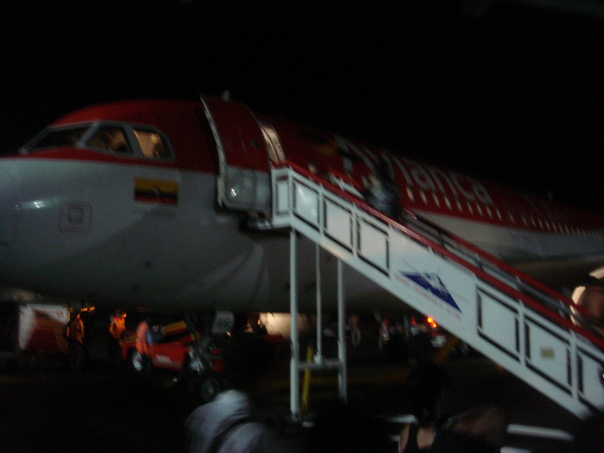 The slightly blurry photo is a close shot of a large commercial airliner painted white and red. |