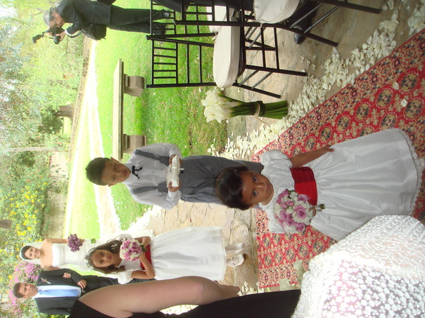 This picture features a walk down the marriage aisle with some kids walking and holding flowers before the bride and groom. |