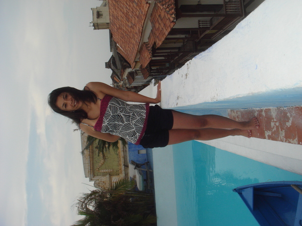 A brunette woman in a tank top and black shorts posing next to the edge of a swimming pool. |