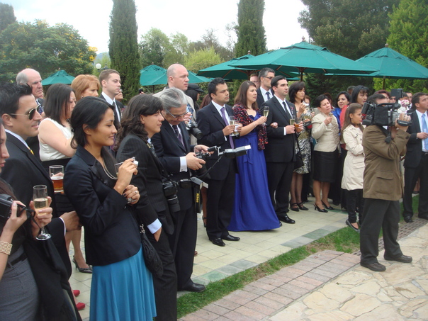 A group of people are gathering, most of them with cameras and video recorders.