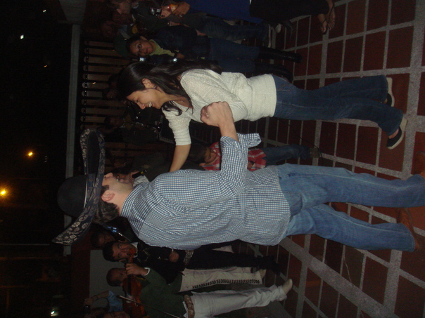 A young adult couple dancing while a man is wearing a mariachi sombrero. |
