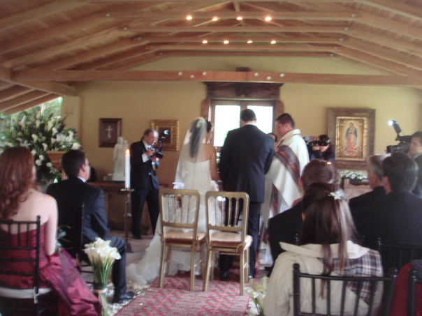 The bride and groom prepare to exchange vows in front of a clergyman.
