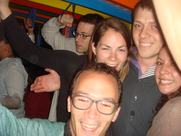 Many young people are smiling happily on a crowded, brightly colored bus. |