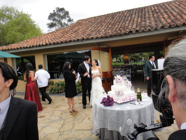 A bridge and groom stand under a stucco roof preparing to cut the cake. |