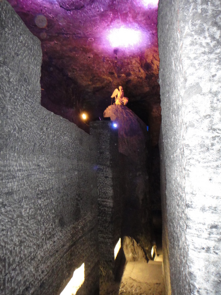 In this cave there are a lot of cool looking neon purple lights with an statue. |