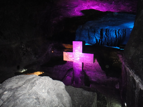 a photo of a cave with different LCD lightning, and a stone cross |