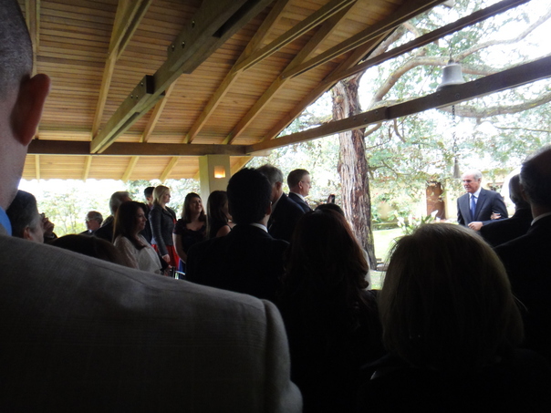 The crowd full of family and friends stand waiting for the bridge to walk down the aisle. |