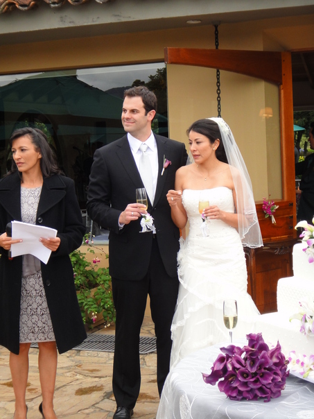 A pride and a groom are setting their cups up for a toast next to a woman that is holding papers. |