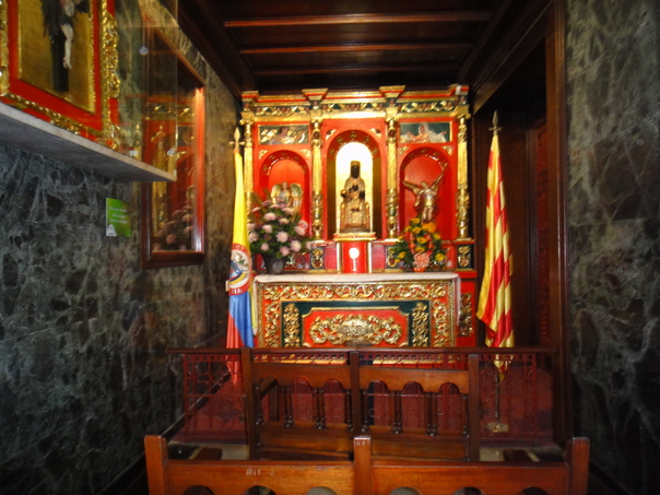 The brightly colored red and gold shrine was located at the end of a grey, stone paneled room beyond a wooden fence. |