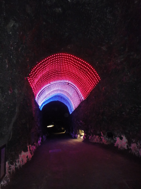 Travel through a concrete and stone tunnel with overhead red, white and blue LED lights along with occasional footpath lights to guide you. |