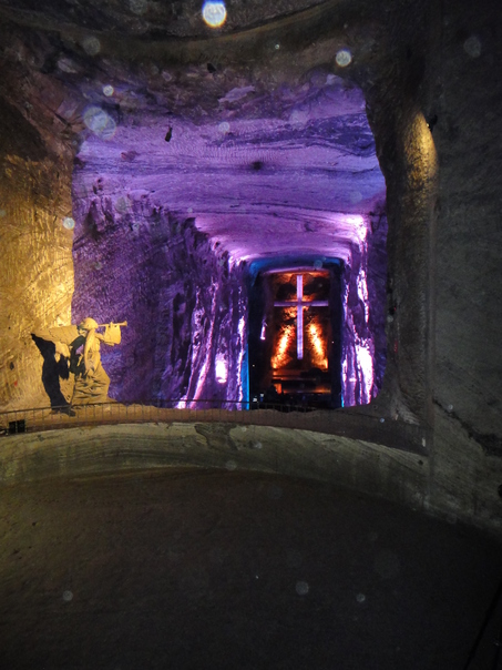 A cross appears in the distance amidst a purple light with a stone angel in the foreground. |