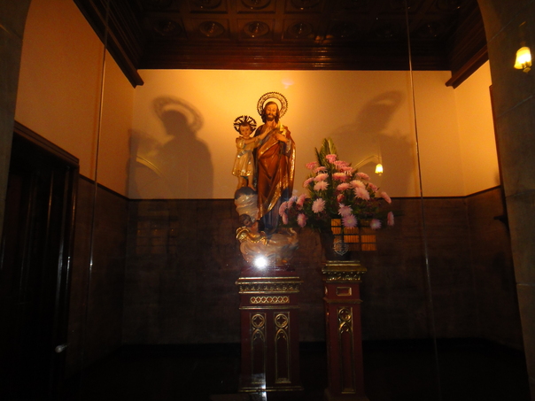 Jesus at the alter with pink flowers in a vase, both placed on top of a decorated podium. |