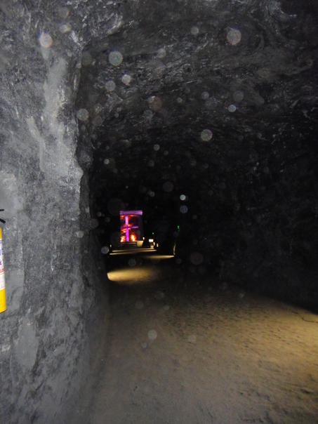A distant, purple neon light glows at the end of a long, dusty stone tunnel. |