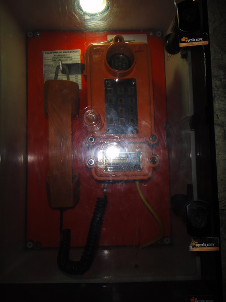 This is an orange, red, black and yellow emergency telephone that has a light shining above it. |
