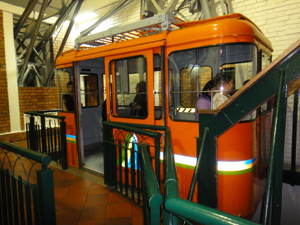 Four to six people in what appears to be a ski lift with an open door, waiting to rise. |
