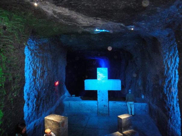 Blue lights shine onto a big cross in a cave-like area. |