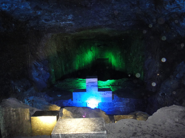 There is a small cross with blue light shining from it in a cave. Behind it is a green light, and in front of it yellow light. The cross appears to be in a dark cave.