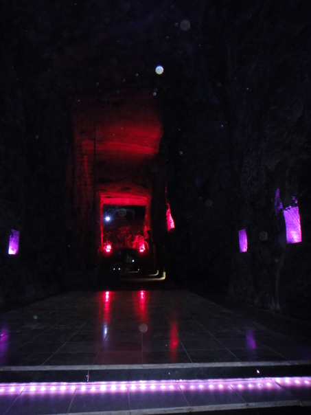 A dark hallway lined with tiles is surrounded by purple and red lights. |
